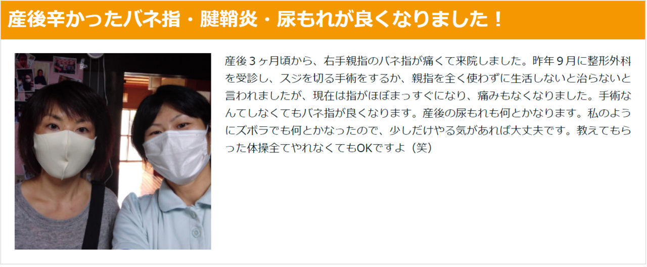 ほんとうに体操をしているだけなのにどんどん痛みがなくなって洗濯ばさみをパッチンとやるだけでも激痛で常に痛いのが普通になっていたのが、ばね指だったっけ?と思うくらいになって本当にビックリです。